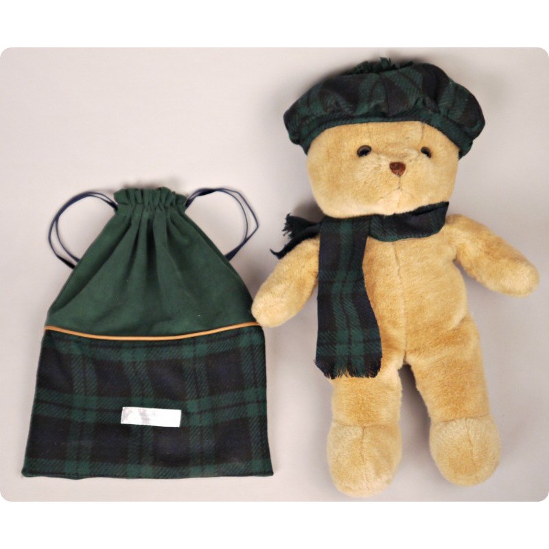 Está hecha la parte de arriba de algodón verde botella, la parte de abajo es de cuadro escocés y en el centro lleva un vivo camel.