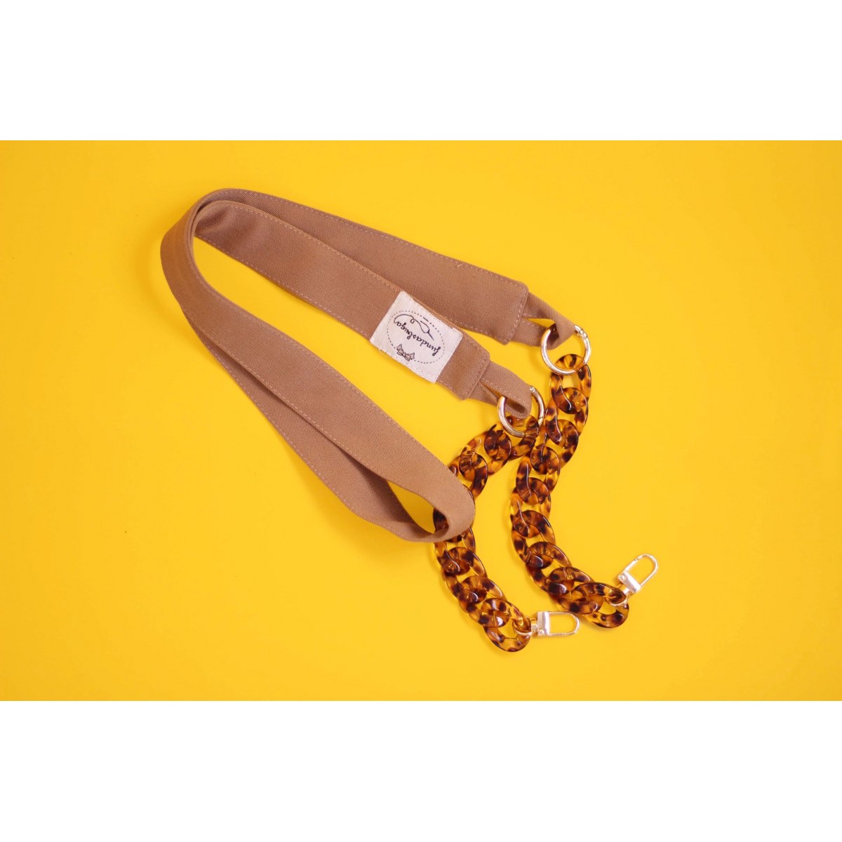 Cuelga móvil de estilo boho chic en color camel con cadena diseño carey.