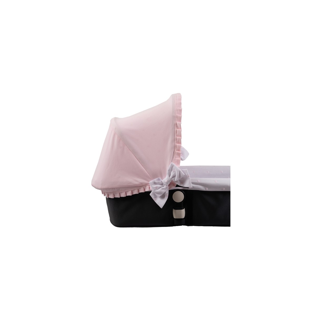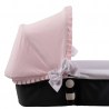 Va adornada toda alrededor con un bonito plisado y en los laterales lleva dos lazos de pique bordado (incluidos en el precio).