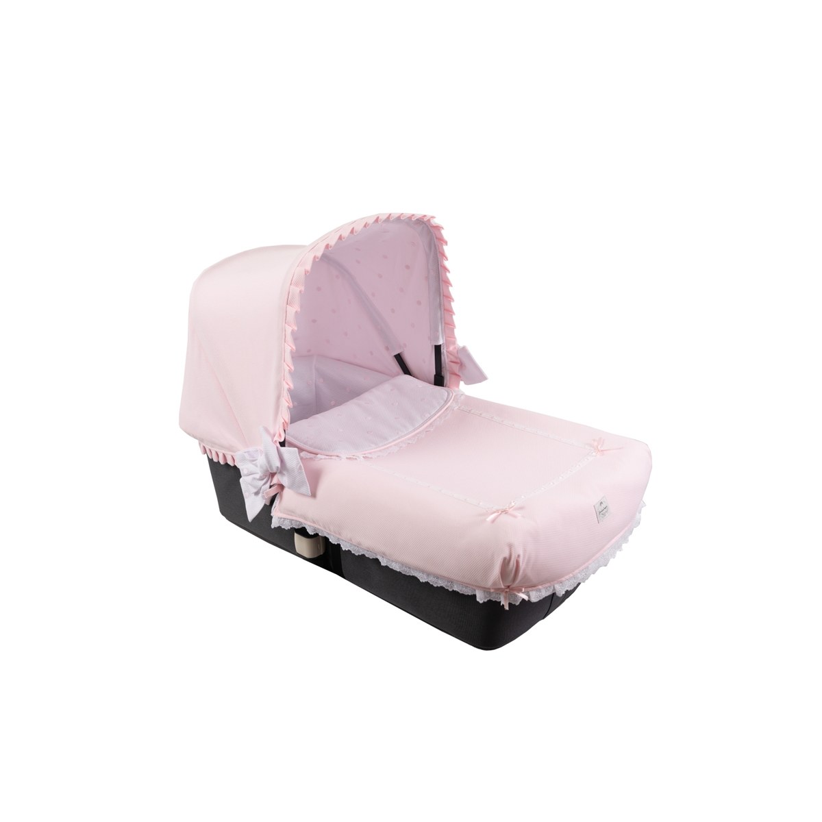La colchita va adornada con pasacintas y lleva todo alrededor una tira bordada de batista blanca.