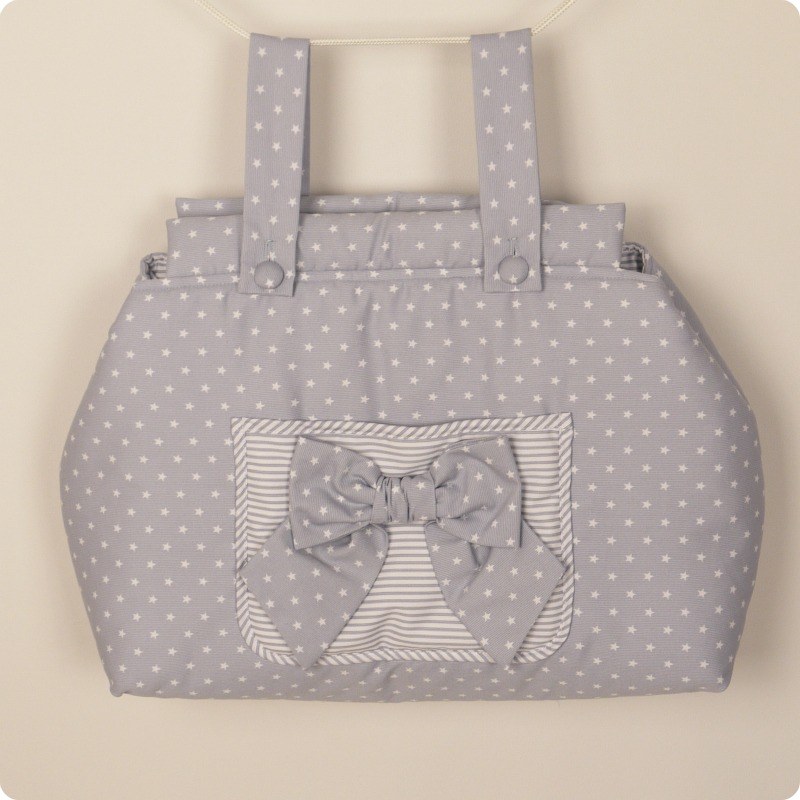 Bolso Modelo Silvestre en tejido milrayas estampado en estrellitas. Si lo desea podemos bordarle el nombre de su bebé para hacerlo aún más personal (Opción "Nombre bordado"="Sí" y no olvide rellenar el campo de texto al final de la página con el nombre que quiera que bordemos, pulsando "Guardar" antes de añadir al carrito de la compra.