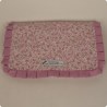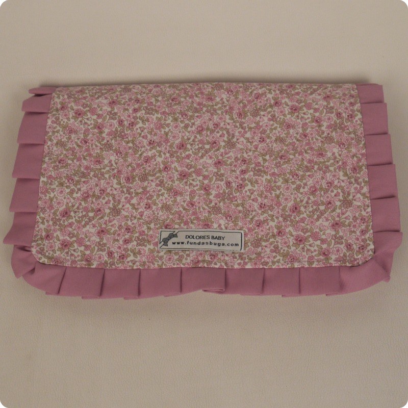 Este bonito cambiador es por un lado de Viyella con estampado floral y por el otro lado es de rizo plastificado para evitar que traspase. Lleva alrededor un plisado al tono.