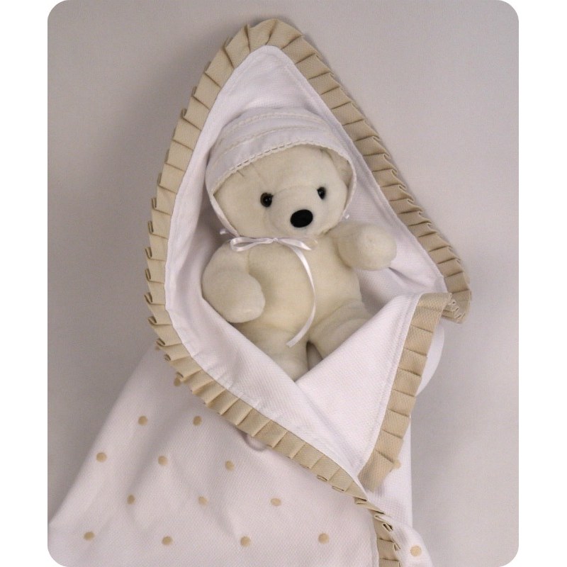 Este bonito arrullo esta hecho en su parte exterior de tela bordada con bodoques y su interior es de piqué nido liso. El plisado es también liso y esta por los dos lados.