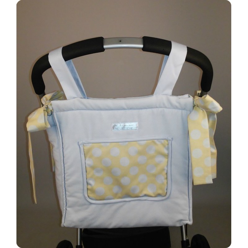 Bolso Panera Simba confeccionado en tela de piqué de canutillo en color azul celeste combinado con tela estampada de lunares grandes sobre tela en color beige.