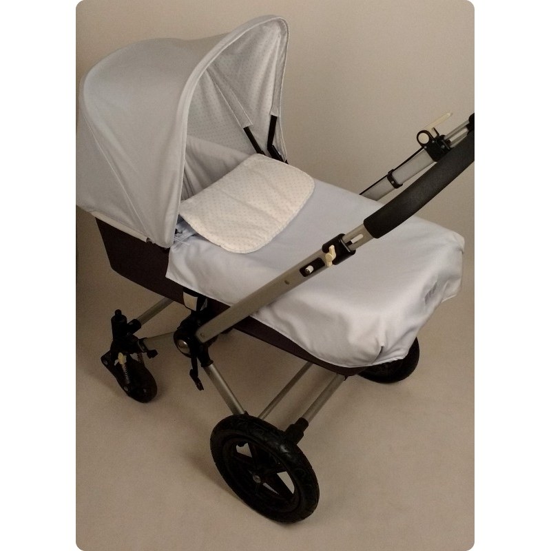 Pack confeccionado con colores suaves y telas de piqué. Compuesto por un cubrecuco blanco de piqué de canutillo, y una capota de color azul cielo en el exterior y motas al tono en su interior y la colcha a juego es de color azul cielo con el embozo en estampado de motas al tono