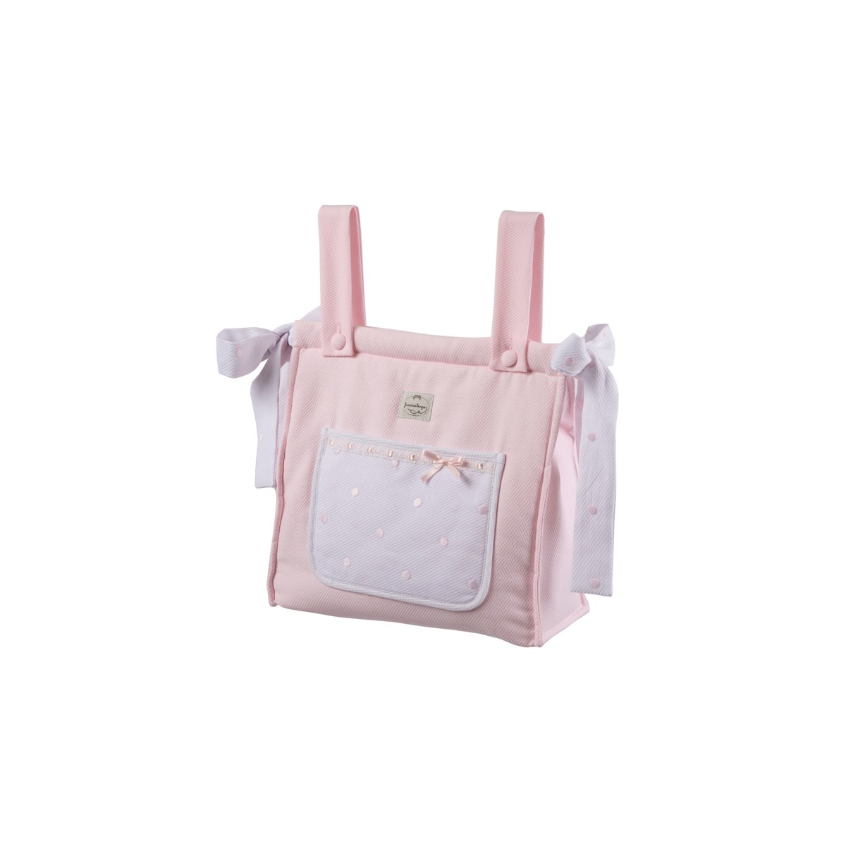 Este precioso bolso está confeccionado en pique nido en color liso. El bolsillo exterior es de pique nido bordado con bodoques en color coordinado, y como adorno lleva un lazo en el centro del bolsillo exterior