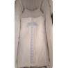 Este bonito saco lígero esta confeccionado en su exterior e interior de otomán blanco con bodoques bordados también en blanco, el centro va cerrado con cremallera y lleva para adornar un pasacintas con cinta de color en piqué. En la parte superior lleva dos botones con dos presillas para que se quede más cerradito como tipo capucha y así que el bebé vaya mas recogido.