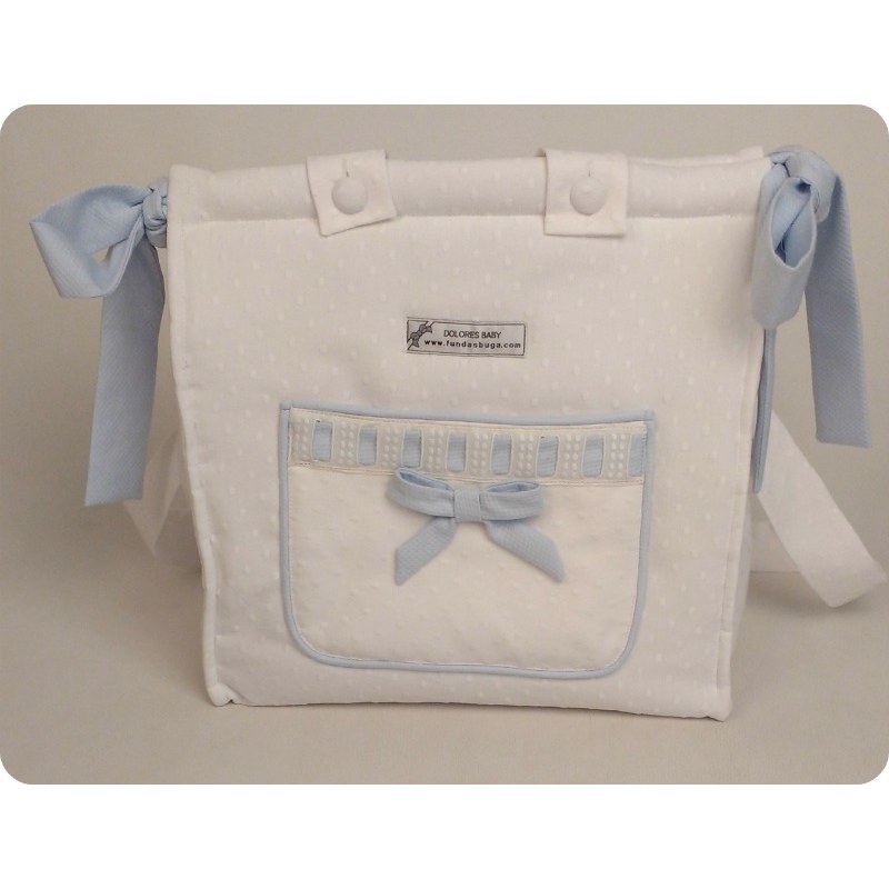 Está confeccionado en tejido de otomán blanco con bordado con bodoques blancos y lleva como adorno un bolsillo en el centro con un lazo.