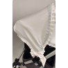 La capota modelo Paris está confeccionada en otomán con bodoques bordados todo en color blanco. Está adornada con un plisado de la misma tela y pasacintas con cinta de piqué en color celeste, rosa, beige, gris y marino.