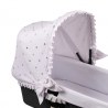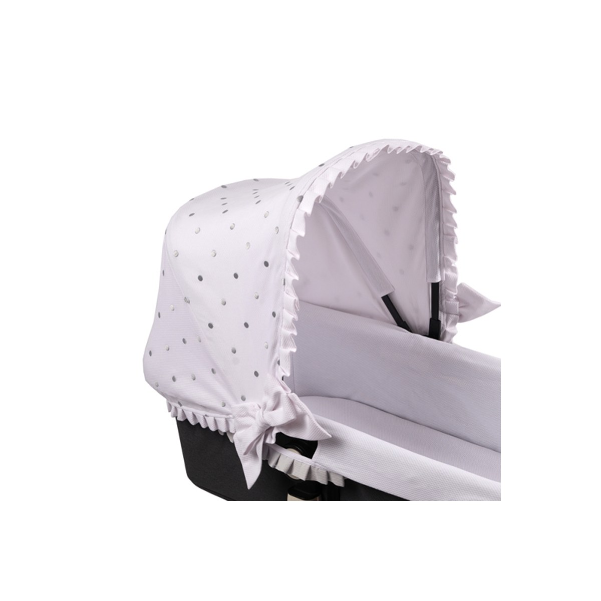 La capota está confeccionada en su exterior con piqué nido de fondo blanco con bodoques bordados y en su interior con piqué nido blanco.